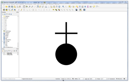 According to the symbol ID, the program searches for the appropriate line in the text file and performs parsing of the text. Commands for drawing a symbol (line points, polygons) are identified using separators (special characters). Within each command, the symbology of individual elements (color, strength and line type, etc.) is processed and written to the appropriate layer. Finally, optional operations such as merging layers, converting from vector to raster format, and the like are performed. The algorithm was debugged in the Python scripting language in the QGIS environment. Figure 4 shows a church symbol in QGIS. This emblem was designed as a common symbol for map works in the Czech Republic and neighboring countries [32]. The symbol description according to the methodology in Section 3.2 is (the separator is a semicolon):