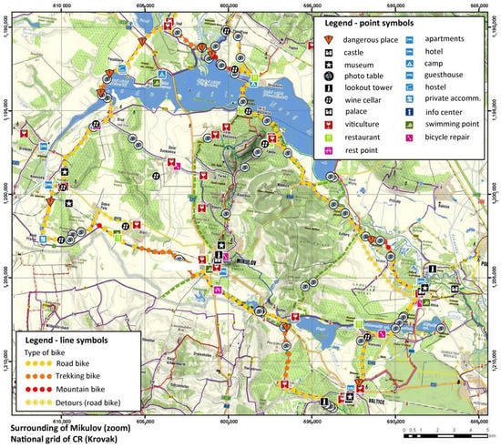 - Bartoněk, D.; Ježek, J.; Vacková, E. Design of the line symbols on the map of cycling paths by gis support. Adv. Sci. Lett. 2015, 21, 3515–3520. [Google Scholar] [CrossRef]