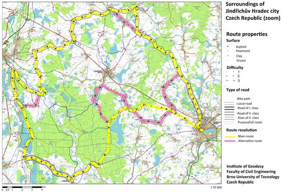 The proposed method was verified when creating special maps for cycling. In this case, it was necessary to display the route map with additional information such as type of surface, difficulty of the road, type of road (1st, 2nd, or 3rd class road), etc. An example of these maps is shown in Figure 8 and Figure 9. Maps for bike paths were also created for the web environment—the link is to [44].