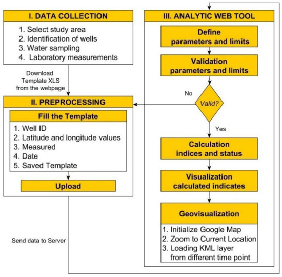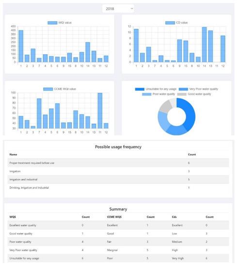 The geovisualization tool was developed using different technologies and programming languages. The geovisualization of the webmap and spatial data was implemented using Google Maps application programming interface (API) v3, Keyhole Markup Language (KML) and Chart.js tools [54,55,56]. The determination of water quality indices was performed by a Javascript code by utilizing the formulas described in the previous section. A filled-up Excel template should be uploaded to the index page of the website so that the determination and geovisualization can be implemented (Figure 1). In order to create the portal, the BootStrap front-end framework created by the developer of Twitter and the interactive interface of Sufee Admin were used [57,58].