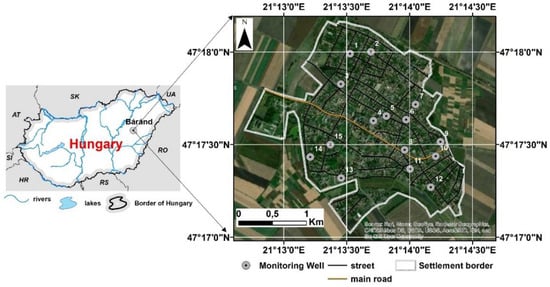Báránd settlement is located in the eastern part of the Great Hungarian Plain (Figure 3). It has a population of 2611 [62]. Construction of the sewerage network in the settlement was completed in 2014. By 2017, more than 95% of households had joined the network. According to our calculations, 30–40% of the domestic wastewater generated (appr. 120,000 m3 each year) could have seeped into the soil and groundwater over the past few decades. This significant pollution discharge has caused heavy contamination in the settlement. Because of this contamination, the wells are monitored every year to detect potentially contaminated areas [63].