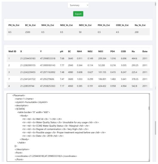 The geovisualization of water quality indices and water quality statuses are provided by the interactive user interface which represent the ratio of the values of each water quality indices and the ratio of their potential usage based on the water quality of groundwater wells. The data to be visualized on the webmap are represented by KML layer. The KML layer contains the results of indices determined based on the groundwater quality parameters of the uploaded wells, where information bubbles near the placemark show the investigated wells based on the degree of contamination, using unique symbols (Figure 5 and Figure 6).