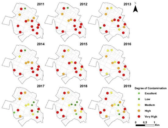 Spatial distribution of Cd indices in the investigated periods (2011–2019).