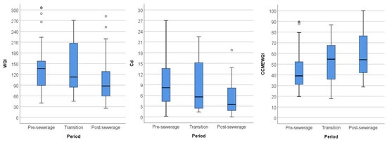 Of course, the effects of sewerage on water quality do not occur immediately, and there is also a natural change in each year. Therefore, in order to better illustrate the effects of sewerage on index values by eliminating fluctuations in each year, the data series was broken down into 3 periods: 1/ the period before the establishment of the sewerage network between 2011 and 2014; 2/ the transition period of 2015–2016; and 3/ the period after the establishment of the sewerage network between 2017 and 2019 (Figure 11). Although positive changes can be seen during the two-year transition period, these values are still more closely related to the data series of the pre-sewerage period. Data for the period 2017–2019 are clearly separate from the data for the pre-sewerage period (Figure 11). The positive changes are supported by further statistical analyses as well. Studying the pre-sewerage (2011–2014) and post-sewerage (2017–2019) data series using Wilcoxon’s signed-ranks test significant differences were shown for all three indices, which is clearly explained by the effects of the sewerage network (Figure 11). The strongest significance (p=0.001) was found in the case of the CCCMEwqi, where the Z value was -3.279. For Cd and WQI nearly identical values were obtained, which significantly indicate the positive effects of sewerage albeit to a lesser extent (Table 4).