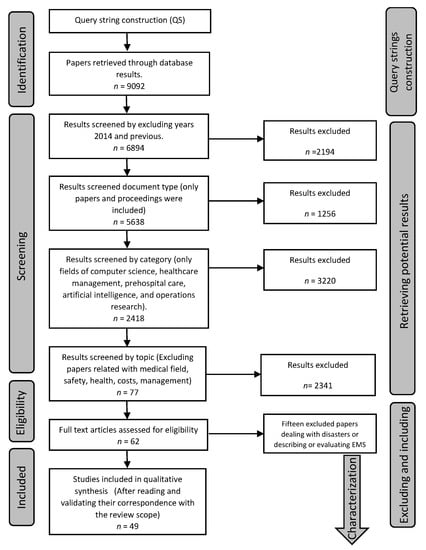 The above, in conjunction with the review method and the inclusion and exclusion criteria, helped to reduce the efforts of exploring quality scientific information, as the review seeks to determine the most recent and relevant developments and applications in the dynamic ambulance location problems. A complete view of the whole review process is shown in Figure 1 The initial query string (QS) was: