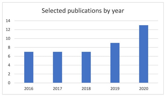 The filtering process depicted in Figure 1 allowed us to review 49 documents. The trends in the selected papers’ publications can be observed in Figure 2. From this figure, it can be concluded that the number of publications related to this topic is increasing, showing that this is a relevant research topic in the scientific community. This topic is critical, considering its impact, as described in the introduction.