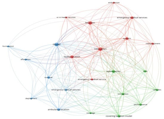 The search process followed the steps described by Sanchez et al. [18]. The keywords used in the process are location, relocation, ambulances, deployment, machine learning, forecasting, and redeployment. According to Figure 3, simulation and EMS are the most relevant topics within the ambulance location/relocation problems. This fact indicates that simulation is a frequent solution approach for this type of problem. From the diagram, it can also be concluded that there is considerable concern regarding the inclusion of equity issues.