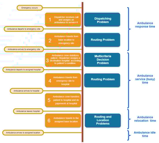 Figure 4 shows that some operations in the process, such as stabilizing the patient at the emergency site, are within the medical field. Other procedures are in the administrative area, as the hospital time, in which the crew may perform some auxiliary medical operations. Still, the main objective is to transfer information regarding the patient, vital signs, applied medical procedures, among others. The dispatcher performs administrative functions with the assistance of an information system. This information system should allow the dispatcher to determine the position of the different idle ambulances and the distance from the emergency site to the destination hospital. The dispatcher, in this step, evaluates the emergency report and determines the degree of severity of the incident to proceed with the dispatching decision. This decision involves determining the type and quantity of vehicles needed to service the emergency call, which is available at the time of the emergency. Once the dispatcher assigns an ambulance(s) to an emergency or determines a destination hospital, the ambulance(s) should reach their destination as soon as possible; in these cases, a routing problem emerges.