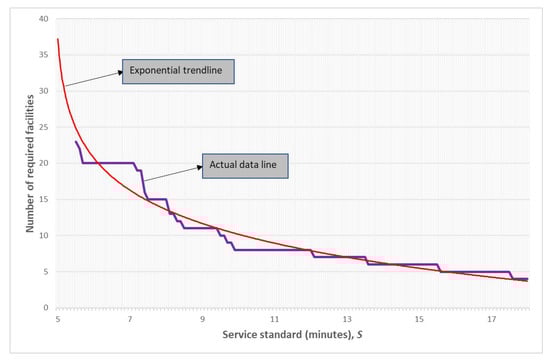 Toregas [23] proposed an integer linear formulation for EMS location based on the principle that EMS should meet a response time threshold value to maximize the survival probability of injured people. The objective of this formulation was to minimize the number of facilities required to meet the demand within the response time threshold value. This model is known as the Location Set Covering Problem (LSCP). This first approach lets them identify that reducing this threshold value may exponentially increase the number of facilities required (Figure 6).