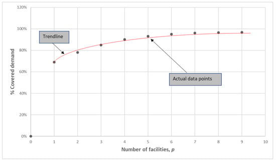 On the other hand, healthcare systems usually have a maximum amount of money to spend, i.e., a fixed number of ambulances to deploy or locate. Therefore, it is reasonable to state the problem as maximizing the covered demand within the service standard(s). This model is known as the Maximal Covering Location Problem (MCLP) and was proposed by Church and Revelle [25]. The solution of this approach shows that the marginal coverage gain reduces as the number of ambulances increases, obtaining a similar plot, as shown in Figure 7. Altogether, these four approaches (P-central, P-media, LSCM, and MCLP) form the basis on which most ambulance location models have been developed. All of them are well suited for the EMS facility (i.e., ambulance) allocation, depending on the objective and particular conditions of the problem.