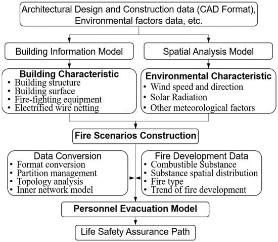 For building fire simulations and evaluations, previous studies have mainly focused on fire development theory, building structure and form, building materials, influential factors, process models, emergency responses, and standards [2,5,9,10,11,12,13]. The numeric fire scenario simulation approach mainly contains three types, e.g., network-based, regional, and zonal [14]. Yang et al. (2012) simulated fire development trends for different locations using temperature measurements in interior building corridors, elevators, and staircase exits [1]. Bi et al. (2013) adopted the finite element analysis method to analyze the behavior of a reinforced-concrete-framed structure during a fire scene simulation, as well as the temperate distribution and deformation calculation of the structure [15]. Jurickova (2014) pointed out that the geometry, ventilation, and construction method are critical when designing buildings, especially for coordination between civil and fire protection systems in large buildings [16]. Setting an optimal safe distance between buildings is also important for fire protection [17]. Previous studies have achieved good results in different scenarios, although three-dimensional information is still lacking. To solve this problem, building information modeling (BIM) was gradually introduced into simulation modeling [18]. Song et al. (2019) proposed a combinatorial spatial data model (CSDM) to describe the complex geographic relationship with the indoor spatial environment during fires [19]. Machine learning is also widely used to predict the spatial distributions of fire conditions [20]. These studies simulated fire scenarios while considering different complicated factors efficiently and intelligently.
