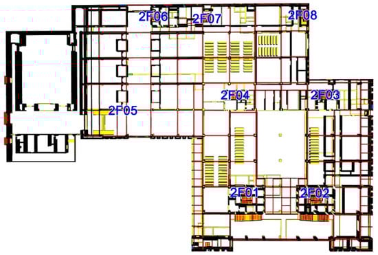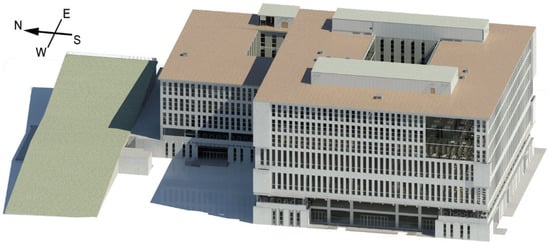 In this study, the library of the Nanjing Forestry University was selected as the research object. Compared to other buildings, the inner structure of the library is relative complex, the population density is much higher, and the types of combustible substances are very dense. The library adopted a transverse frame structure, which contains the main building and annex building, and its service life is 50 years (Figure 2). The total construction area and base area equal 47230.8 m2 and 7651.4 m2, respectively. The building height is 34.9 m, which includes seven floors aboveground and one floor underground. The fire resistance rating is first-class. The earthquake fortification rating is seven degrees. The waterproof grade is first-class. For the inside of the building, the middle of the first and second floors contains an atrium structure, with a rectangle structure from the third floor to the seventh floor. There is a large number of reading rooms and lecture theatres, in addition to a large quantity of books, bookshelves, tables, and chairs in the corridors. Additionally, there are multiple staircases between the floors, distributed in the middle of the four corners of each floor. Therefore, the research object is a typical public agglomeration and key fire monitoring area, for which it is necessary to carry out a fire simulation.