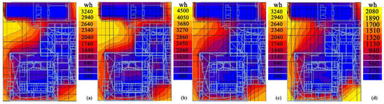 By using the solar radiation model in ArcGIS software, an illumination analysis in the library was processed with an illumination and solar radiation equation time range of 08:00 to 18:00. The spatial solar radiation was simulated in four seasons around the library. Due to the effects of occlusion, the solar radiation centered on the building gradually reduced in the library and the surrounding area (Figure 3). Additionally, the solar radiation presented an increasing trend in the first half of year and reduced in the second half of the year. Across the four seasons, solar radiation reached its maximum in summer at 4500 w/m2 and declined to its minimum in winter at 2080 w/m2. Compared with the value of 4020 w/m2 in autumn, the maximum solar radiation was much lower in spring at 3240 w/m2. According to mathematical–statistical results and the RWC, the 90th percentile value was nearly the maximum over the four seasons. Therefore, the maximum value was selected for the construction of fire scenarios in different seasons.