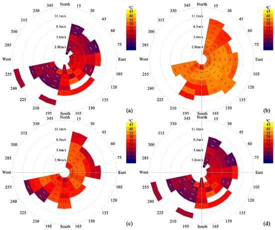 Temporal variations in wind frequency and temperature around the library in spring (a), summer (b), autumn (c), and winter (d).