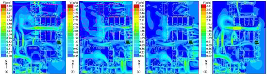 Second, compared with other seasons, the strength of the southeasterly wind at 6.0 m/s is much more significant in summer, while the speed of the inner airflow is relatively high in the whole library. The main building is more prominently affected by southeasterly wind. As seen in Figure 5b, one airflow can enter the reading room from both the south as well as the east and move along the corridor, reaching the atrium at high speed. Additionally, another airflow travels through the corridor channel located on the north zone from east to west in the main building. According to the spatial distribution of the airflow, the first airflow coming from the reading room moves quickly and its effective area is much larger. If a fire breaks out here, the fire and smoke will spread to other zones quickly and could even affect the safety of the whole library.
