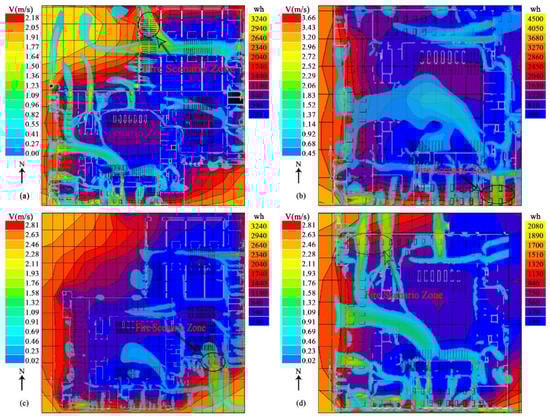 First, influenced by northwesterly winds with a maximum of 4.4 m/s in spring, airflow moves from east to west along the corridor (Figure 5a). For the annex building, the airflow cannot result in a baffling effect because there are fewer obstacles in the corridor. When the airflow moves through the corridor in the hall the wind does not weaken. The main building is mainly affected by the airflow coming from the western gate and the northwest side door. After these two airflows meet together in the hall the direction of the airflow will experience a 45° deflection and change to the northwest. Therefore, once a fire breaks out in the northwest zone it will spread indoors under the influence of the airflow.