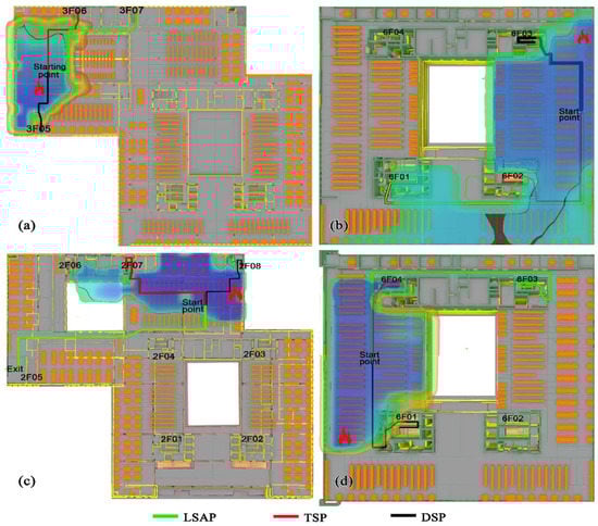 Here, the distance of the life safety assurance path was 94.0 m, and its available evacuation time was 125.3 s in summer (Table 10). The LSAP overlapped with the TSP over the original section (Figure 7). However, with the development of the fire risk, the LSAP to the other floors was much lower than with the TSP. Therefore, we selected the first floor stairway as the exit. About 150 s after the fire started, the section of the LSAP influenced by the fire products was much smaller than the DSP. The section of the life safety route affected by fire was much shorter than for the DSP. After 300 s, the influence of the fire products became stable in the building. The second stairway in the TSP was seriously affected by fire products. The visibility, temperature, and carbon monoxide all exceeded the critical values. In contrast, the fire products in the first stairway in the LSAP did not reach the critical value. These conditions were also suitable for personnel evacuation, although no advantages were seen at all in terms of time or distance.