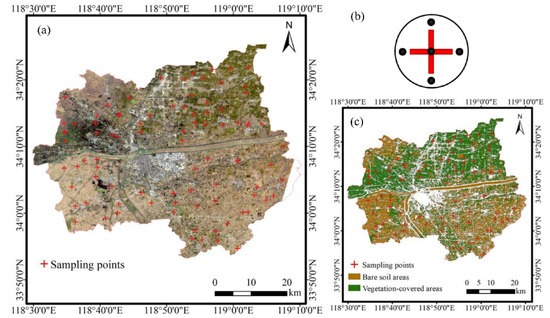 (a) The true-color satellite image (R: 662 nm, G: 551 nm, B: 482 nm) of Advanced Hyperspectral Imager (AHSI) data of ZY1-02D satellite obtained on 22 October 2020, in Shuyang County, (b) the schemata the for five-point method, (c) distribution of bare soil and vegetation-covered areas.