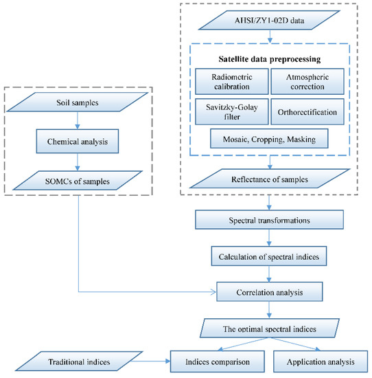 The flow chart of this research is shown in Figure 3. The whole process can be divided into three main steps: (1) obtaining SOMC and reflectance spectra of soil samples, (2) constructing the optimal SIs, and (3) evaluating the application effect of the optimal SIs.