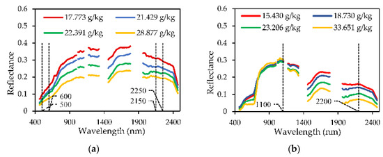 Based on the processed images, the reflectance spectra of the pixels at 92 sampling points were extracted. In the bare soil area, it can be seen from Figure 4a that the reflectance spectrum decreases with the increase in SOMC in the entire 400–2500 nm range. In the range of 500–600 nm, the slope of the curve decreases with the increase in SOMC. There is a spectral absorption in the range of 2150–2250 nm. These are consistent with the results of previous studies. Bartholomeus et al. [22] found that in the 400–700 nm range, there was a flatter spectral profile at higher SOMC, and Jin et al. [23] found that there was a spectral absorption at 2200 nm. On the whole, the extracted reflectance spectral curves can clearly depict the soil spectral variation patterns at different SOMCs.