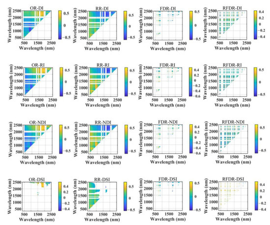 Because the values of OR-NDI and RR-NDI are opposite to each other, and the wavelengths used are the same, it is sufficient to choose one of them. When modeling, the optimal SIs obtained by OR-NDI were adopted. Therefore, there are 24 optimal SIs for the bare soil area and 189 for the vegetation-covered area.