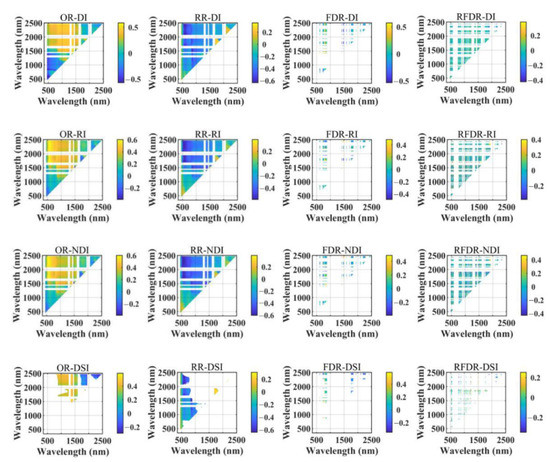 Sixteen types of SIs were calculated by four transformed spectra (OR, RR, FDR and RFDR) and four index formulas (DI, RI, NDI and DSI). All available bands of the transformed spectra were substituted into the calculation. Then, their correlations with the SOMC of soil samples in bare soil and vegetation-covered areas were analyzed. The correlation coefficient matrix diagrams are shown in Figure 5 and Figure 6. In addition, the maximum correlation coefficient (||max) between each type of SI and SOMC in bare soil and vegetation-covered areas is listed in Table 8 and Table 9. Considering the performance of various types of SIs in the bare soil area and vegetation-covered area, || greater than 0.600 was utilized as the threshold to obtain the optimal SIs.