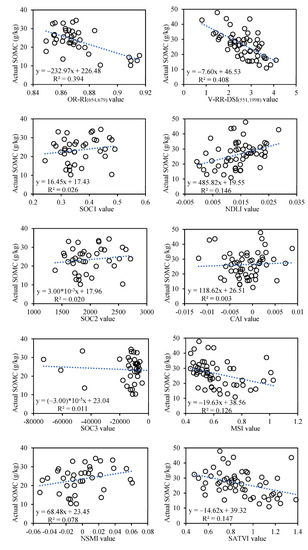 According to Table 8 and Table 9, OR-RI(654,679) and RR-DSI(551,1998) have the highest correlation with SOMC in bare soil and vegetation-covered areas, respectively (the letter ’V’ is added to RR-DSI(551,1998) as a prefix (V-RR-DSI(551,1998)), which represents the optimal SI in the vegetation-covered area). These two indices were selected to construct LR models and compare them with other traditional indices (Table 4). The correlations of SOMC and different SIs are shown in Figure 7.