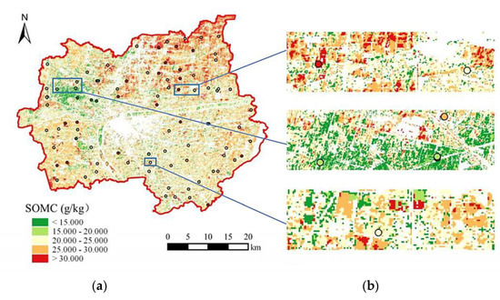 (a) Recognition of SOMC levels in soil samples in cultivated land area of Shuyang County and (b) details of partial enlargement.