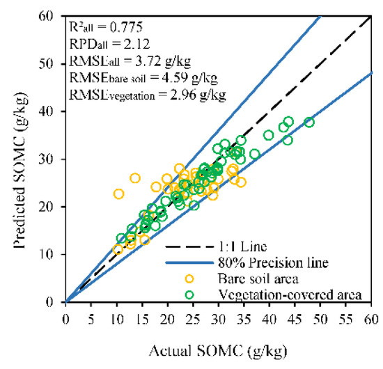 - The results show that the optimal SIs can be used to present the spatial distribution trend of SOMC and recognize SOMC levels. Based on the optimal SIs, the SOMC predicted by the model has a good linear relationship with the actual SOMC of samples. The R2, RMSE and RPD of the soil-vegetation combined prediction results are 0.775, 3.72 g/kg and 2.12, respectively.