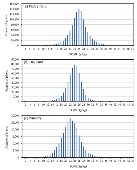 It can be seen from Figure 12 that the SOMC values of the three land types are all normally distributed. Overall, SOMC is the highest in paddy fields, followed by the dryland, and is lower in nurseries. In the paddy field, the SOMC is most concentrated at 25–26 g/kg. In the dryland, SOMC is most concentrated at 23–24 g/kg, whereas the SOMC in the nursery is most concentrated at 21–22 g/kg. The maximum values of SOMC distribution in the paddy field, dry land, and nursery are 49.42, 48.75, 45.43 g/kg, and the average values are 25.34, 23.23, 21.73 g/kg, respectively. There have been similar reports in previous studies. The studies of Bird et al. [67] and Huang et al. [68] showed that a low mineralization rate and the high humification coefficient of fresh organic matters in flooded soils resulted in SOC content in paddy soil that was 11–56% higher than that in dry land soil. Gao et al. [69] found that transforming paddy fields into nurseries would lead to a decrease in SOC.