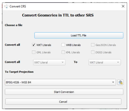 EPSG:25832 coordinate system to either KML or GeoJSON will result in the geometry being converted to the World Geodetic System 1984, as this is the only coordinate reference system valid in the two respective literal types. Hence, a conversion from GeoJSON or KML to WKT will stay in the World Geodetic System 1984 coordinate reference system. To still be able to convert geometries to other coordinate reference systems, GeoSPARQL 1.1 adds the