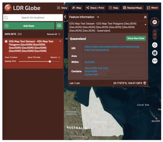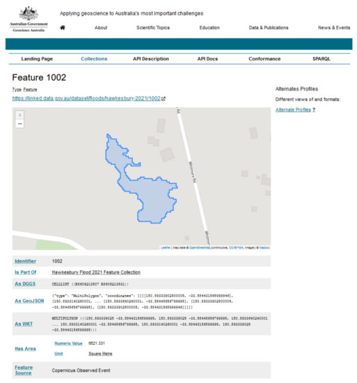 http://floods.surroundaustralia.com, accessed on 30 October 2021) for an instance of its use. This system plans to move its RDF payloads to context-less JSON).