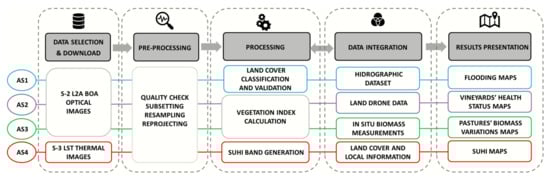The four application scenarios, namely AS1, AS2, AS3, and AS4, operationally share the same workflow structure, typical of many applications based on satellite products [35,60,63,64] (Figure 1).