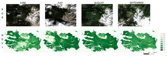 - Fernando, G.; Víctor, C. Pasture Monitoring Applying Normalized Difference Vegetation Index (NDVI) Time Series with Sentinel-2 and Landsat 8 Images, to Improve Milk Production at Santa Mónica Farm, Imbabura, Ecuador. In Computational Science and Its Applications–ICCSA 2020; Gervasi, O., Murgante, B., Misra, S., Garau, C., Blečić, I., Taniar, D., Apduhan, B.O., Rocha, A.M.A.C., Tarantino, E., Torre, C.M., et al., Eds.; Springer International Publishing: Cham, Switzerland, 2020; pp. 560–575. [Google Scholar] [CrossRef]
