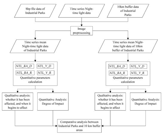 To compare the operation status before and after the outbreak of COVID-19, a quantitative monitoring method based on NTL data was proposed in this paper. The input of this algorithm includes location information of CIPSAs, NTL time series, and COVID-19 case data. The location information of CIPSAs was in the shp file and used to subset NTL time series to the CIPSAs area. The NTL time series were utilized to extract quantitative NTL index and to further evaluate the CIPSA operations. COVID-19 case data were used to provide information such as the start time and changes of the epidemic. The algorithm was conducted by following steps (Figure 1): (1) data preprocessing; (2) calculation of quantitative parameters; (3) qualitative and quantitative analysis based on quantitative parameters; and (4) comparative analysis between industrial parks and 10 km buffer areas.