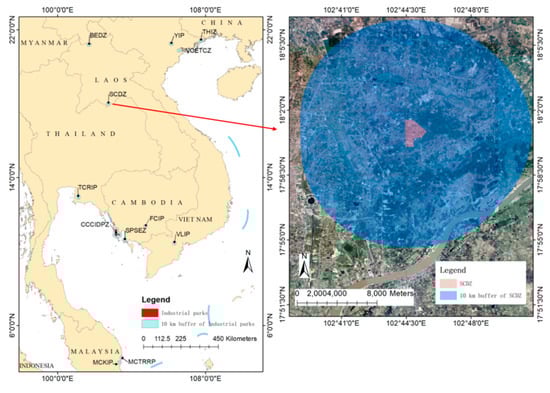 Industrial parks are an important platform for Chinese foreign investment, with more than 30% of Chinese enterprises being concentrated in industrial parks in various countries [27,28]. China’s overseas industrial parks dataset collected by Li et al. included 182 industrial parks [29]. Southeast Asia contains the largest number of Chinese industrial parks and has a close economic relationship with China. However, only 47 industrial parks in this dataset have accurate location information. Among them, 14 parks are located in Southeast Asia and two of these parks are very small. Thus, only twelve CIPSAs situated in Thailand, Vietnam, Cambodia, Laos, and Malaysia were selected as our research objective. Detailed information on these parks is provided in Figure 2 and Table 2.
