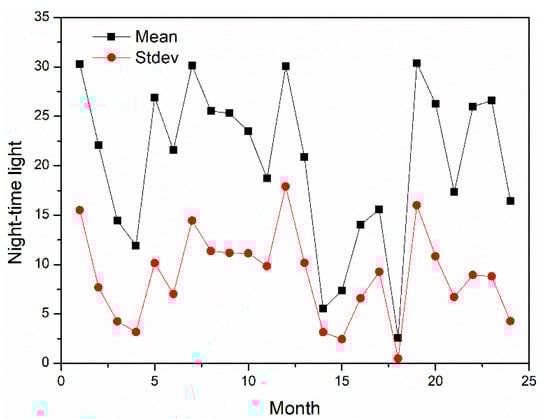 - The monthly mean NTL values of each CIPSA park and in 10 km buffer zones around each CIPSA in 2018, 2019, and 2020 were calculated using the statistical tools in ENVI 5.3 software. Figure 4 shows the monthly mean and standard deviation (Stdev) nighttime light values of Yunzhong Industrial Park, Beijiang Province, Vietnam, from January 2019 to December 2020.
