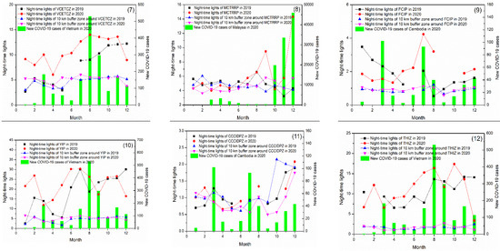 (1)–(12)Time series curves of NTL at each CIPSA park and 10 km buffer zone (lines) and new COVID-19 cases (columns) in 2019 and 2020.