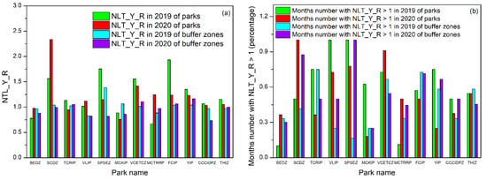The special event of 2020 was the outbreak of COVID-19. Parameter NTL_Y_R2020 is the change between 2020 and 2019. We further calculated the changes between 2019 and 2018-parameter NTL_Y_R2019. Then, parameters NTL_Y_R2020 and NTL_Y_R2019 were compared to find out the impact of COVID-19. The results are presented in Figure 7a. It was found that there are nine parks and seven buffer zones with NTL_Y_R2019 > 1, while the numbers are nine and five with NTL_Y_R2020 > 1, respectively. This indicated that the NTL of these parks and buffer zones increased in 2019 compared to 2018. The buffer zones showed bad performance in 2020. There are eight parks with NTL_Y_R2019 > NTL_Y_R2020, while only six buffer zones with NTL_Y_R2019 > NTL_Y_R2020. This indicated that the NTL of these parks and buffer zones increased more significantly in 2019.