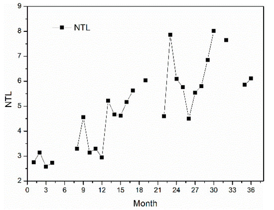 Monthly NTL_Y_R2019,i was also calculated to show the monthly change between 2019 and 2018. The number of months (NM2019) with NTL_Y_R2019,i > 1 was counted, which indicated that the NTL of 2019 in month i was higher than 2018 while having NM2020 with NTL_Y_R2020,i > 1. Due to the influence of the cloud, there was no data for certain months. Moreover, the NM2019 and NM2020 cannot be directly compared. Thus, the NM2019 and NM2020 were divided by the number of months with data from 2019 and 2020 to obtain NM2019,p and NM2020,p in percentage. Figure 7b shows the results of a comparison between NM2019,p and NM2020,p. It was found that there were seven parks with NM2019,p > NM2020,p, while there were only three buffer zones with NM2019,p > NM2020,p. Based on the above parameters, it can be understood that although the NTL of most parks increased in 2020, the rise was less significant in 2019. This can be seen clearly from the NTL curve of SPSEZ park from January 2018 to December 2020 (Figure 8).