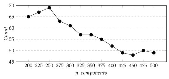In practice, BIC is widely used, while in this study we plan to predict the 200 subway stations areas in the future. We obtained the clustering regions through the GMM model and Algorithm 1, sorted their weights in the mixed model and selected the -200 regions. Considering how to select the appropriate parameter , so that as many of these 200 areas as possible will cover new subway stations in the future, while ensuring that the predicted total coverage is as small as possible. However, the BIC criterion does not solve this problem very well. In order to do this, we propose defining variables as the number of actually subway stations we predict built from 2013 to 2020, S as the area covered by all clustering regions, and is the area occupied by each prediction station. Figure 7, Figure 8 and Figure 9 respectively show the change curves of , S, and with the value of .The purpose of defining these two variables is to find appropriate parameters so that the number of new stations predicted by the whole city is the largest and the total area of the predicted area is the smallest.