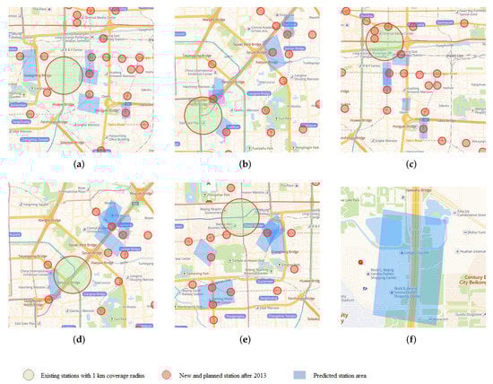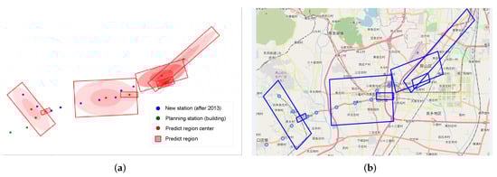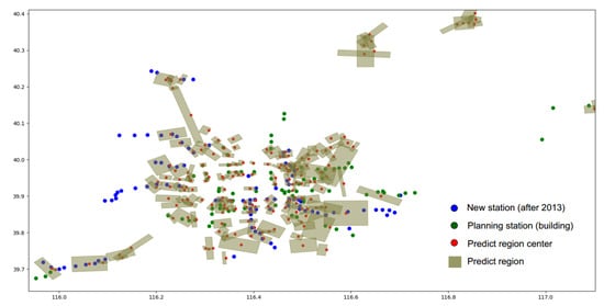 In addition, we use the Weighted LeadeRank algorithm to get the subway stations with high importance, and select some representative stations as the basis to predict the location area of the new stations in the future as shown in Figure 13, where we choose the 1 km coverage of the built station as the experimental object, and through the model calculation, the clustering rectangular area covers some new subway stations built after 2013.