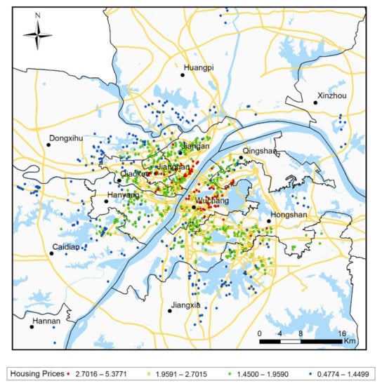 - Wen, H.; Jin, Y.; Zhang, L. Spatial heterogeneity in implicit housing prices: Evidence from Hangzhou, China. Int. J. Strateg. Prop. Manag. 2017, 21, 15–28. [Google Scholar] [CrossRef]
