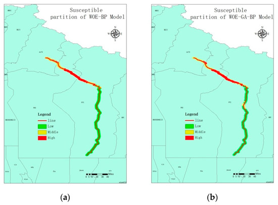 - The location of the high-susceptibility concentration area calculated by the three models is unchanged, and all of them are between DK57 km and DK116 km. After the BP neural network weight optimisation, the DK 230–DK 231+300 km susceptibility grade is improved, from low susceptibility area to medium susceptibility area. After the GA-BP model weight optimisation, the susceptibility level of DK23–DK33+400 km is improved, especially the DK32+400 km–DK33+400 km section is changed from a medium- to a high-prone area.