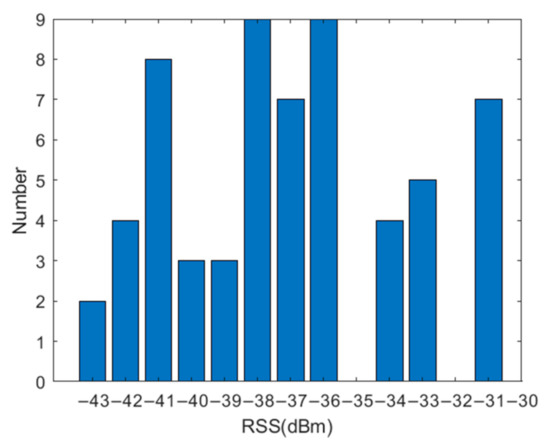 To clearly illustrate the RSS fluctuation, we conduct an experiment that collects 60 samplings continuous from an AP at a fixed RP by using Xiaomi MI-2. Figure 1 shows the statistics histogram. It can be seen that even at the same location, RSS also changes over time. A similar experimental result is reported in [45]. This phenomenon shows that few samplings do not accurately reflect the RSS distribution, which decreases the positioning accuracy by only using a single feature of RSS [19,20].