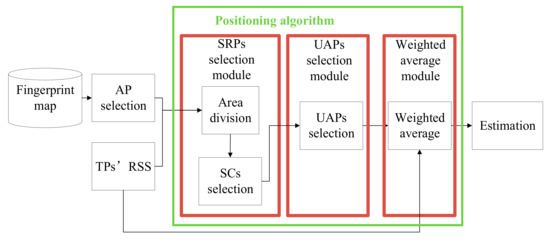 However, RSS is easily affected by diverse interference (AP power outage or running mal-function, obstacles, etc.). Some of the APs’ information (AP location, propagation path, etc.) collected online have been changed compared with the APs’ information collected offline. The changed information enables us to make a large positioning error [16,17]. Therefore, removing the useless information is meaningful for positioning. Furthermore, the fluctuation of the signal is another major issue. The RSS of each AP at the RP should be an interval, not a fixed value, due to the measured noise. To comprehensively consider all collected RSS samplings, RADAR [18] and HORUS [10] have been proposed. However, they only consider the influence of fluctuation on offline fingerprint maps, ignoring the impact on online TPs. Generally, the online RSS received at the TP for positioning is only 1~2 sampling(s), making it hard to reflect the RSS interval of the TP. Therefore, the above issues may make the positioning accuracy decrease.