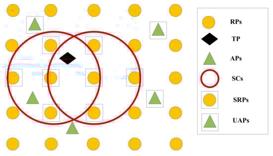 The actual location of the TP is expressed as , and the fingerprint map consists of RPs’ locations and corresponding RSS. Assume that there are M APs and N RPs. The location of RPs can be stored as . represents the location of . The RSS collected at is expressed as follows: