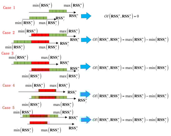 Thus, the intervals and can be represented as and , respectively. The IOD algorithm [30] first calculates the OI between and , which is the length of the red interval in Figure 4, and then normalizes the to get the value of , i.e.,