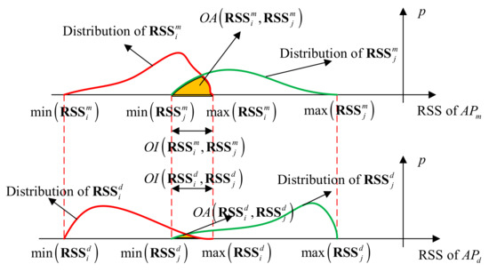 The IOD algorithm [30] only considers the one-dimensional RSS interval overlap, which ignores the distribution characteristics. We improve the IOD algorithm by expanding the one-dimensional interval overlap length into a two-dimensional overlap area (OA). As shown in Figure 5, when the OA area is larger, the importance of AP is lower. Otherwise, the importance of AP is higher. The area of the two-dimensional overlapping part is positively correlated with the probability p. Based on the OA, is proposed to evaluate the importance of . The is calculated as follows: