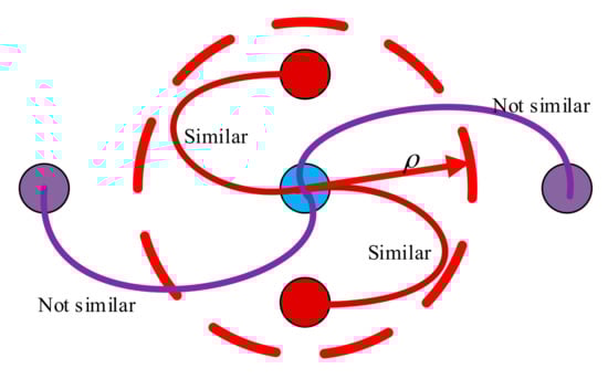 Based on the first characteristic, area division with distance threshold ρ is used to distinguish the RSS similarity between RPs. Note that a large improper threshold may generate the RPs with a distance less than ρ with a large signal distance variance, decreasing the positioning accuracy. According to our experiments, the best value of ρ should be set between 1 and times the adjacent RP spacing (more details can be found in Section 5.3). As the fingerprints are collected at known locations, it can compute the spatial distances between and . The RSS characteristics between two RPs are similar if the corresponding spatial distance is less than the threshold ρ. Otherwise, the RSS characteristic is not similar. Figure 6 shows the determination of RPs with similar RSS.